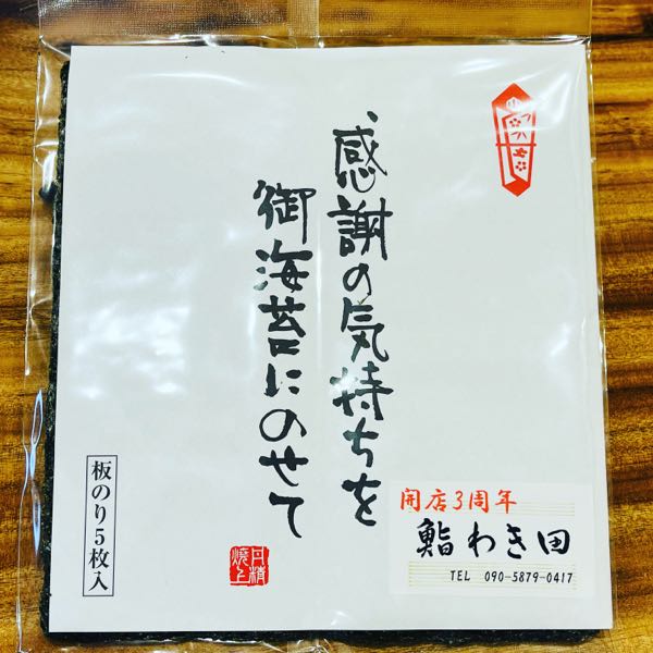 ほんの気持ちですが、お土産を用意しております。当店で使っております西三河産の初摘青混ぜ海苔です。
